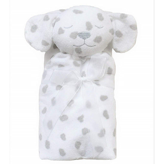 • Load image into Gallery viewer, Those puppy dog eyes will get you everytime! This dalmatian napping blanket from Angel Dear will sure to be your little ones best friend. Measuring 29" x 29", it has a plush animal head, embroidered facial features and is machine washable.