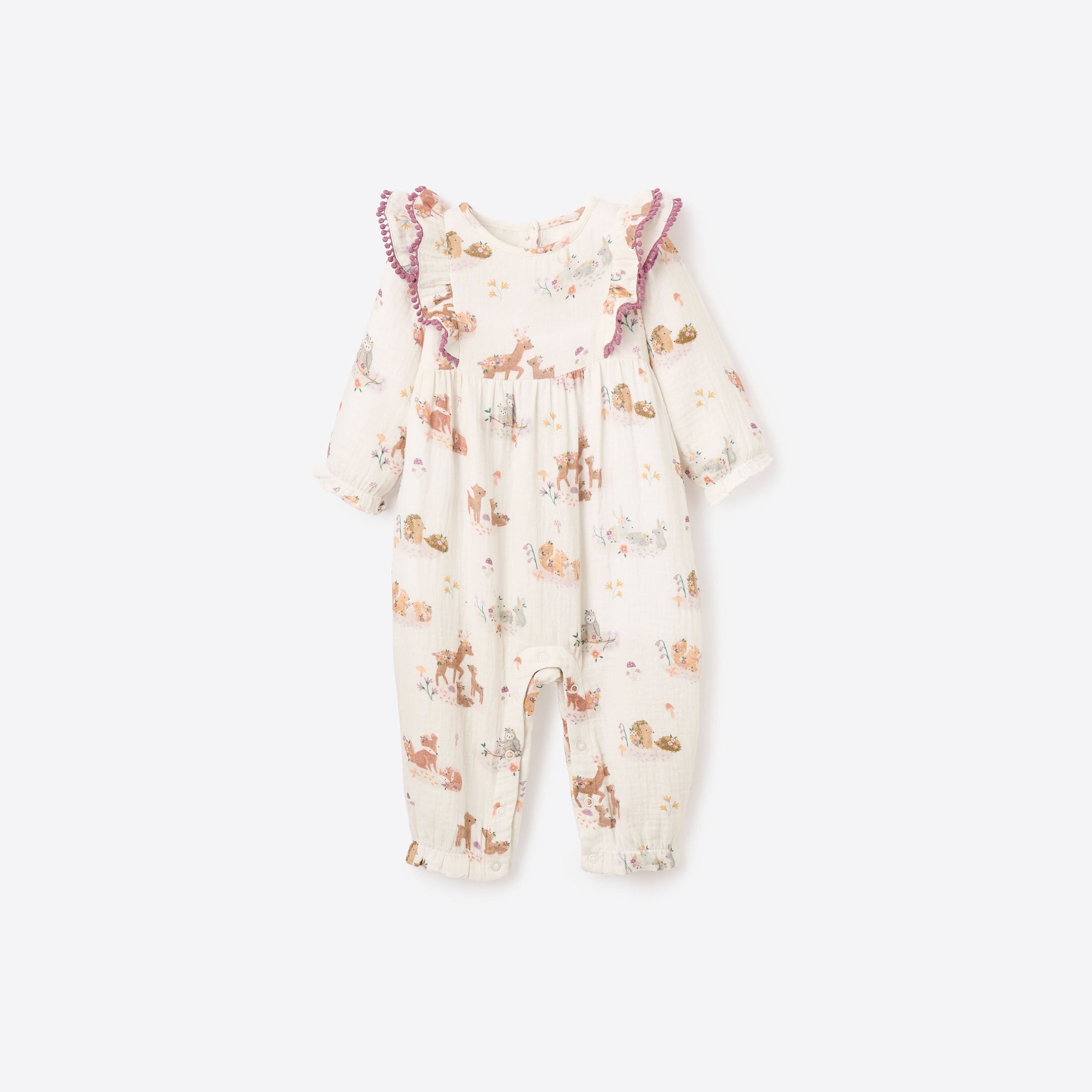 Wrap your little one in whimsical woodland charm with the Infant Girl's Organic Muslin Forest Family Printed Ruffle Jumpsuit. Featuring sweet woodland characters and delicate ruffle details, this soft, breathable jumpsuit is perfect for cozy playtime and outings. Ideal for adding a touch of nature-inspired magic to your baby's wardrobe.