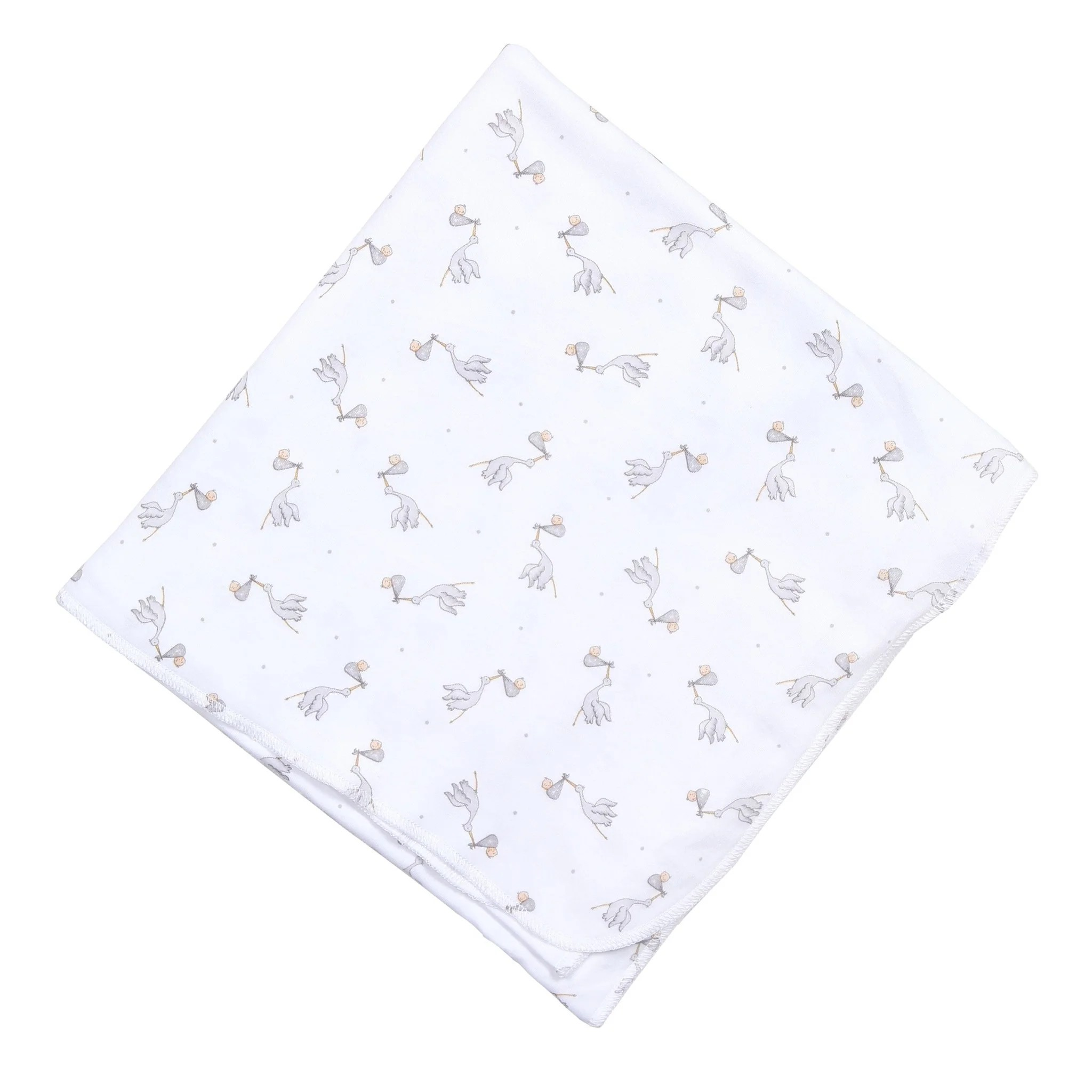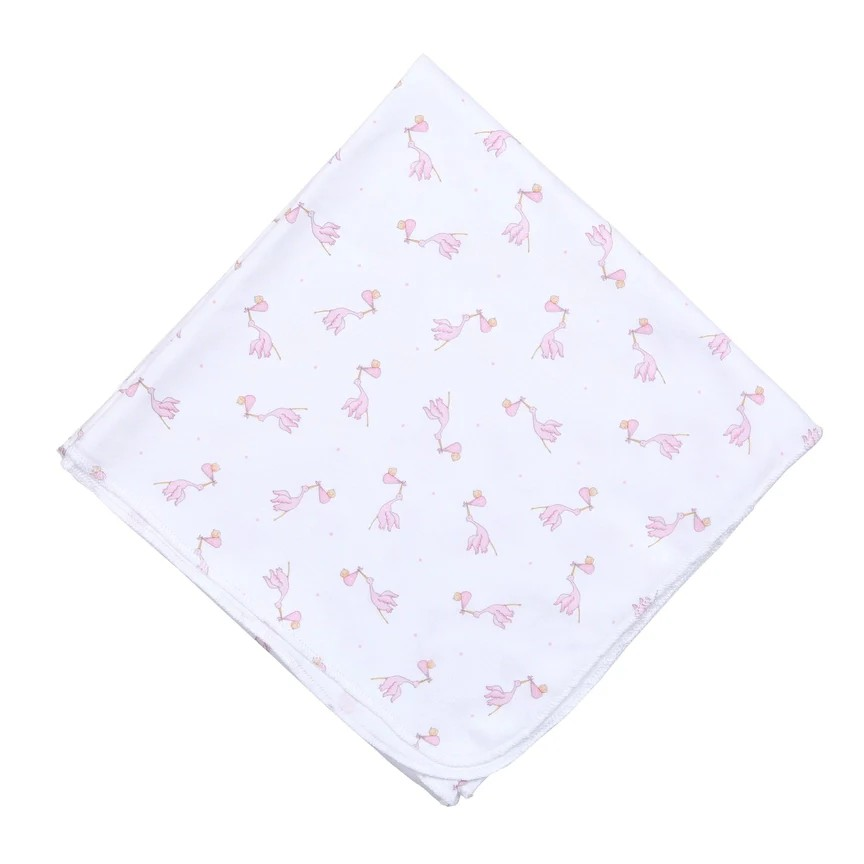 Wrap your little one in gentle comfort with the Magnolia Baby charming Worth the Wait Printed Swaddle Blanket! Crafted from luxurious Pima Cotton, this blanket embodies the tender inspiration of a new baby's arrival. Designed in a versatile white with a delicate grey and pink stork print, it's perfect for any little one.