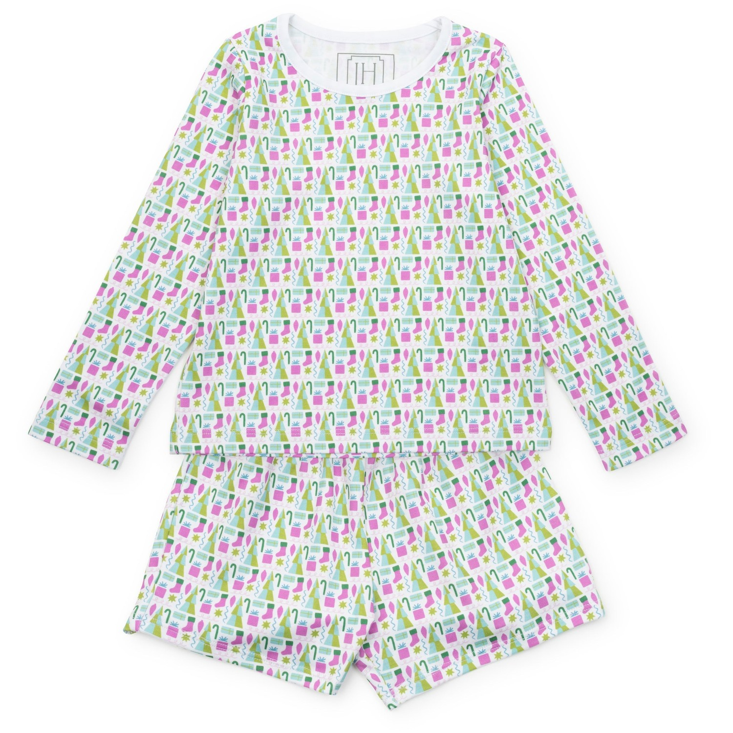 Keep her cozy and stylish this holiday with the Sophie Girls' Lounge Short Set in Mod Holiday Pink by Lila & Hayes. This two-piece set features a long-sleeve top paired with comfortable shorts, designed for relaxed yet vibrant loungewear. The fun retro-inspired print adds a playful touch, making it perfect for festive gatherings or cozy days at home. Let her shine this season with a look that’s as cheerful as it is comfortable.