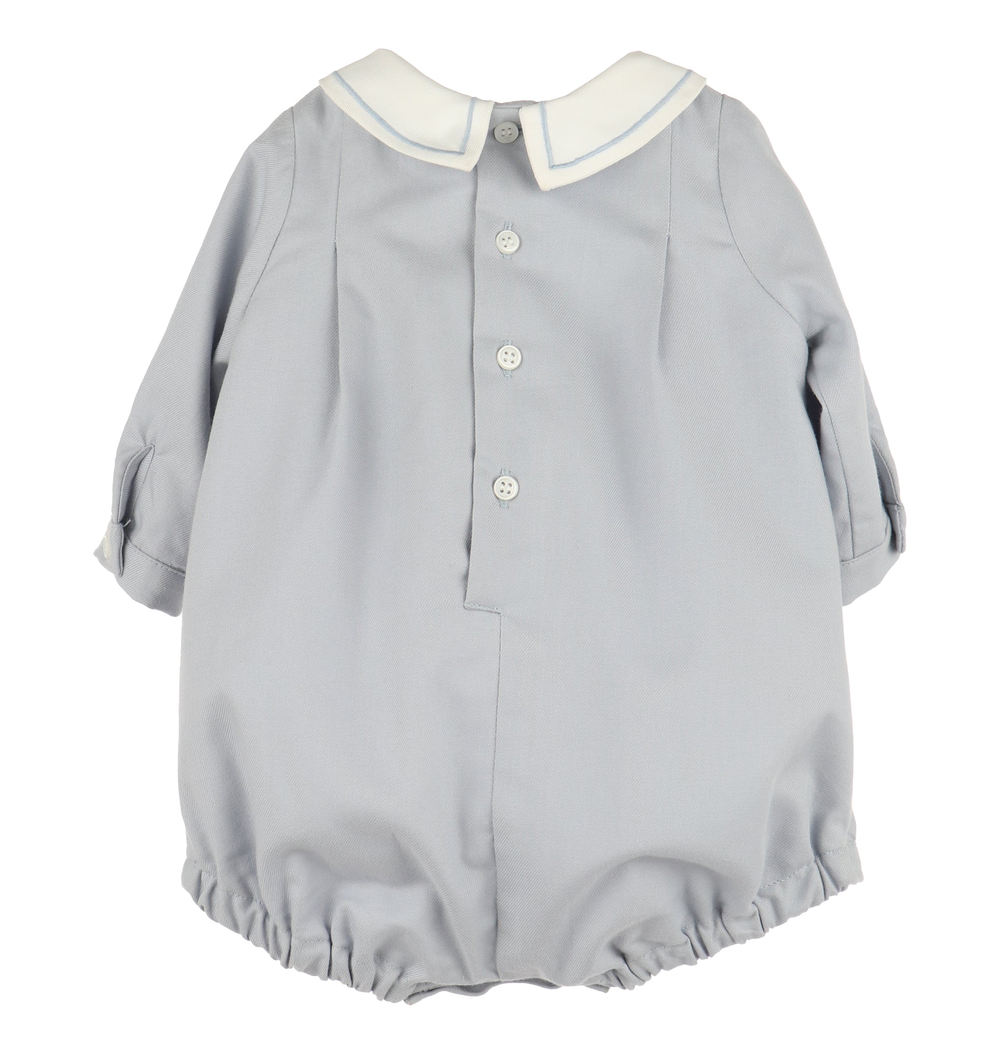 Crafted for timeless charm, this Infant Boys Dusty Blue Smocked Bubble features a classic Peter Pan collar with delicate embroidered borders. The front showcases hand-smocked embroidery, adding a refined touch perfect for special occasions or memorable photo milestones.