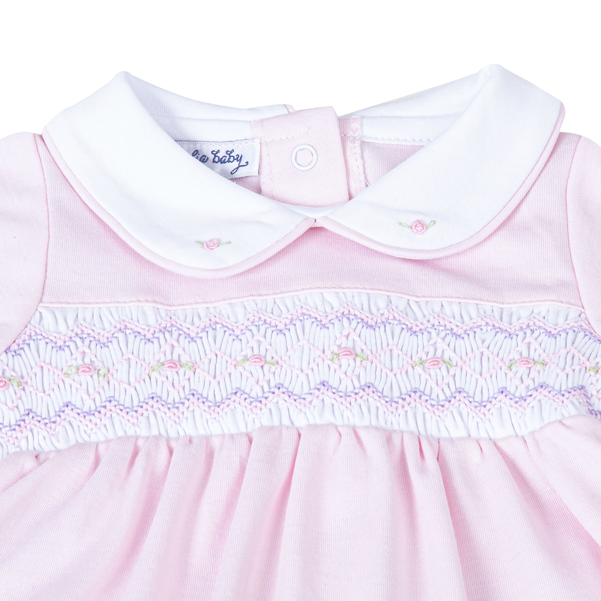 Experience unparalleled comfort for your little one with the Hazel and Hudson Smocked Collar Pink Footie from Magnolia Baby. This adorable footie features a soft pink color and a delicate white peter pan collar with lovely smocking across the chest adorned with sweet pink rosettes. Give your baby a cozy and stylish look today!