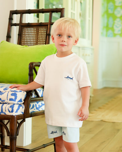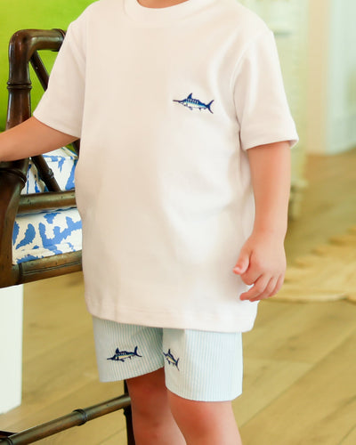 Experience the fierce fun of our Boy's Dino Knit Short Set by Petit Bebe! The soft white knit shirt features adorable dinosaur stitching, while the blue tiny stripe shorts add a playful touch. Perfect for any young explorer's daily adventures.