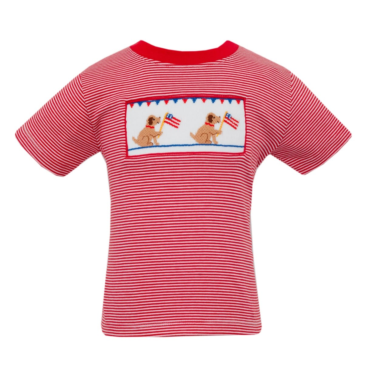 Get your little patriot ready for any occasion with the Patriotic Puppy Short Set by Anavini! This darling set features a red striped top with a cute patriotic puppy smocking, paired with solid red shorts. Perfect for showing off their love for their country and their style.