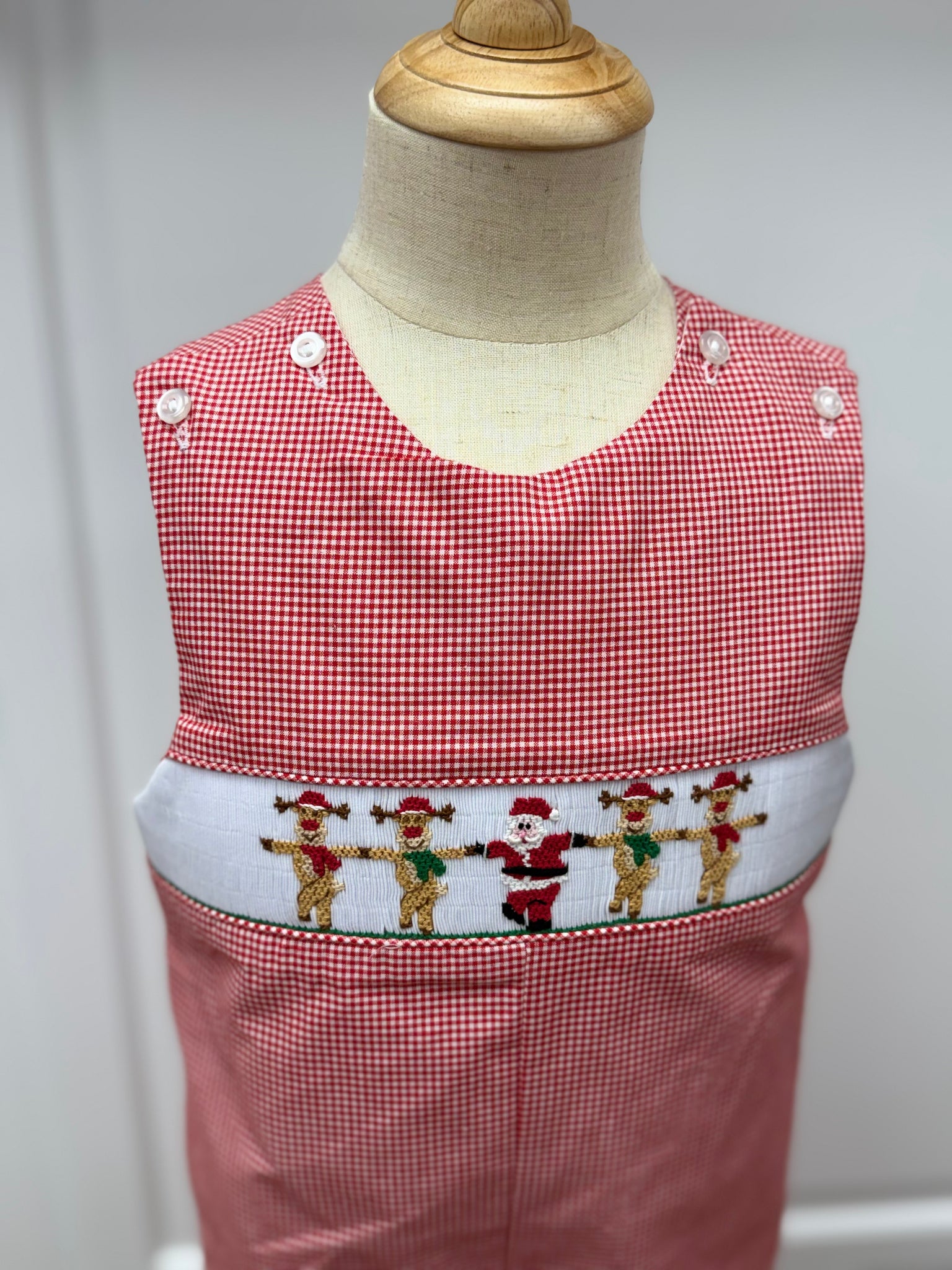Get your little boy holiday-ready with the Boys Rockin' Reindeer Longall. Its red and white gingham fabric is accented by charming smocked reindeer and Santa embroidery, creating a festive and classic look. Designed for comfort and style, it’s perfect for holiday gatherings and pairs beautifully with matching sibling outfits to create memorable family moments.