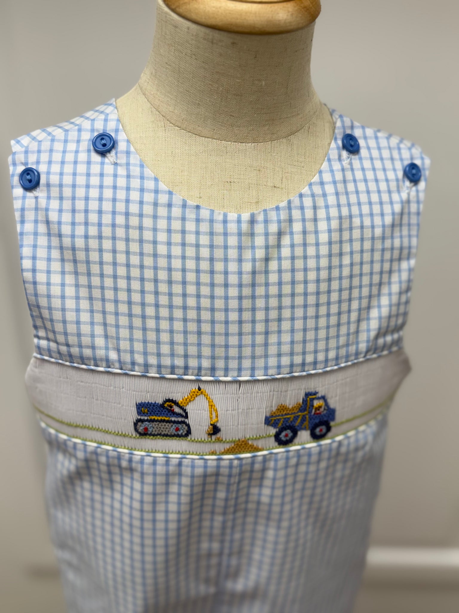 This Boys Construction Site Longall showcases a charming blue and white gingham pattern, highlighted by a detailed smocked construction site embroidery on the front. Designed for comfort and style, it pairs perfectly with a classic Peter Pan collar shirt, creating an adorable and polished outfit ideal for playful days and special occasions.
