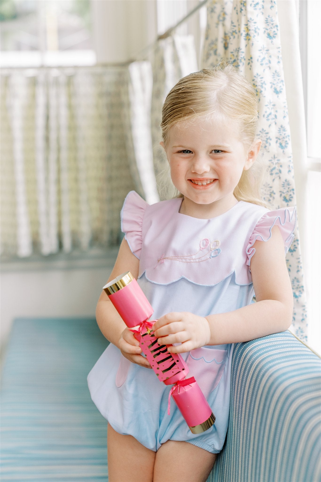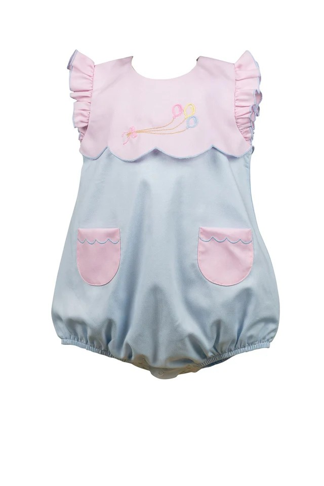 Infant Girls Birthday Balloon Bubble from The Proper Peony. The pink and blue combination is stunning and each scallop is hand-cut. The look is delicate and lovely. The perfect style for any birthday occasion or any other happy day.