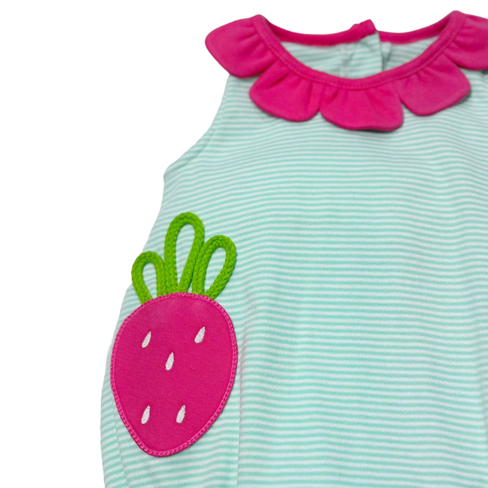 Celebrate strawberry picking season with the Strawberry Reagan Bubble from Zuccini Kids! This adorable knit bubble for infant girls features mint and white mini stripes, a scalloped petal collar, and a sweet strawberry applique. Perfect for creating memories and capturing cute photos!