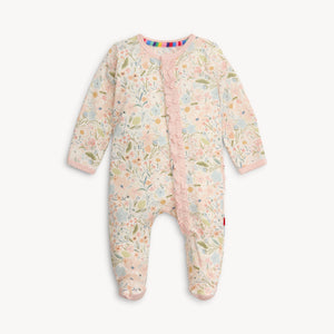 Introducing our Charlotte Ruffle Footie Pajamas! These infant girls pajamas from Magnetic Me are designed with a soft floral pattern and adorable pink ruffles along the front and back. Experience the convenience and ease of dressing your little one with Magnetic Me.
