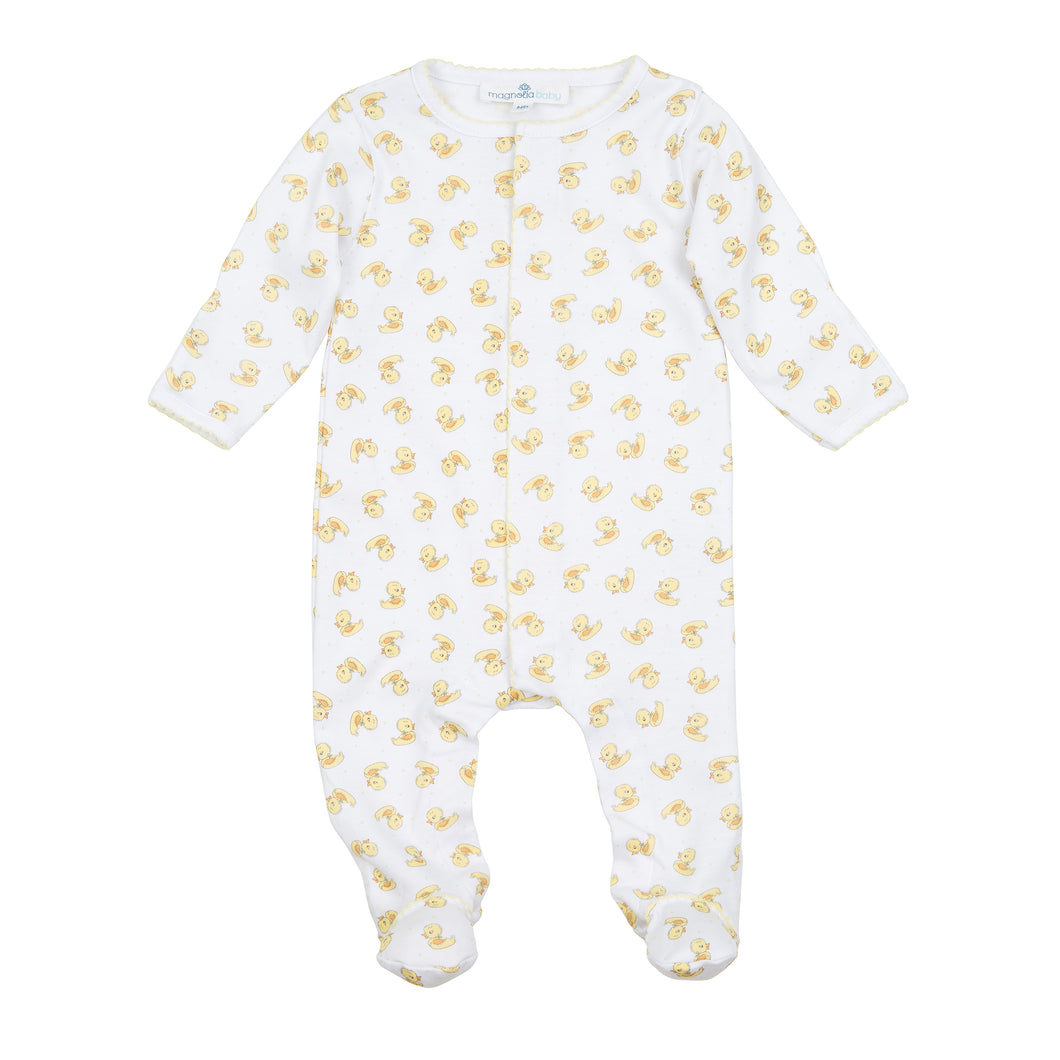 Cozy up your little one in our Darling Duckling Footie Pajamas from Magnolia Baby. Made from 100% Pima cotton, these pajamas feature an adorable print of yellow ducklings on a background of green pin dots. Keep your little one snug and stylish in these adorable footie pajamas.