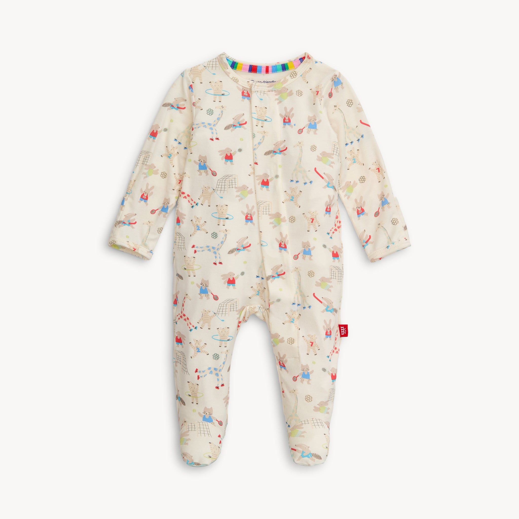 Introducing Furry Field Day Footie Pajamas for infants! These cozy pajamas feature adorable animals playing sports, perfect for your little one. Made by Magnetic Me, they are also easy to put on and take off, making late night diaper changes a breeze. Stay comfy and cute with Furry Field Day Footie Pajamas.
