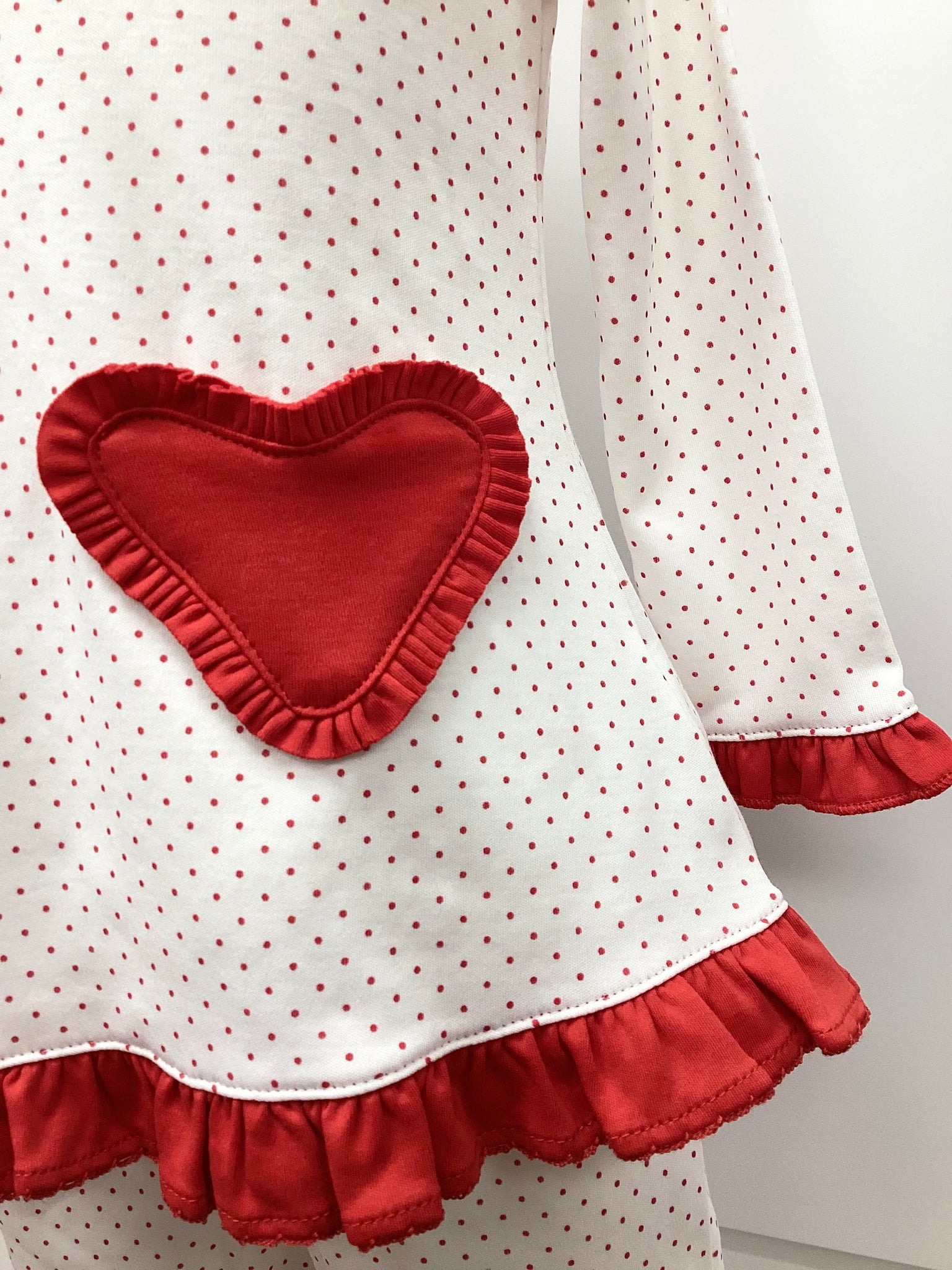 Fall in love with this Girl's Heart Appliqué Pant Set by Squiggles! The white shirt and pants, adorned with red polka dots, are accented by two heart appliqué pockets and a charming red ruffled trim. Perfect for your little trendsetter, it's a stylish and playful addition to her wardrobe!
