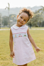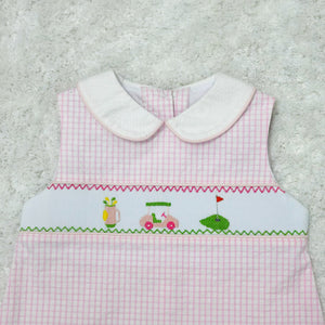 Introducing the Golf Seersucker Pink Dress from Zuccini Kids for toddler girls - the perfect combination of style and comfort for your little future golf enthusiast. Featuring a charming golf cart applique and classic seersucker pink and white, this dress is sure to be a hole in one!