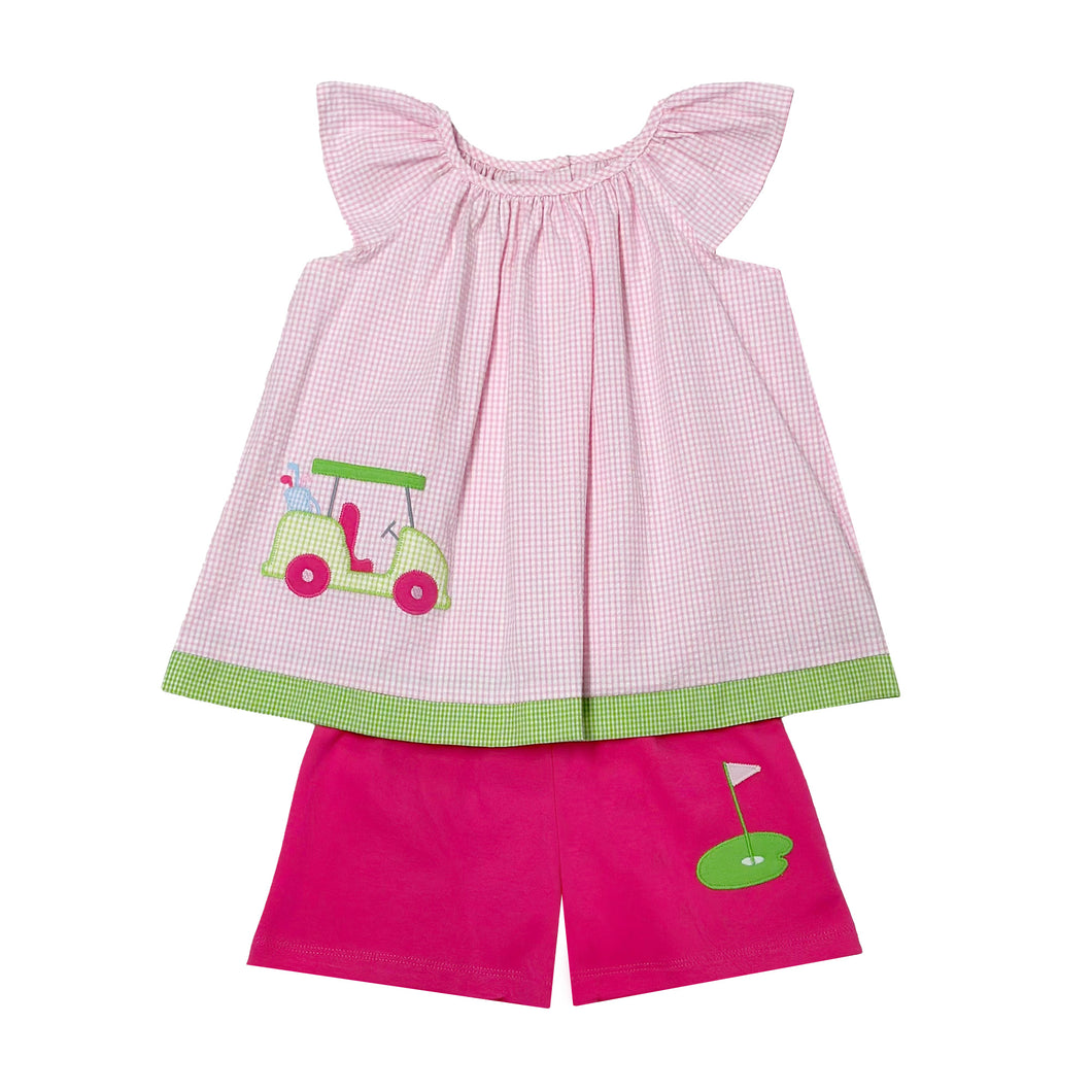Get your little one ready for the links in style with the Pink and White Golf Seersucker Short Set from Zuccini Kids! This sweet outfit features a cute golf cart applique on the sleeveless top and a golf flag applique on the hot pink shorts. Perfect for your toddler girl who loves golf!