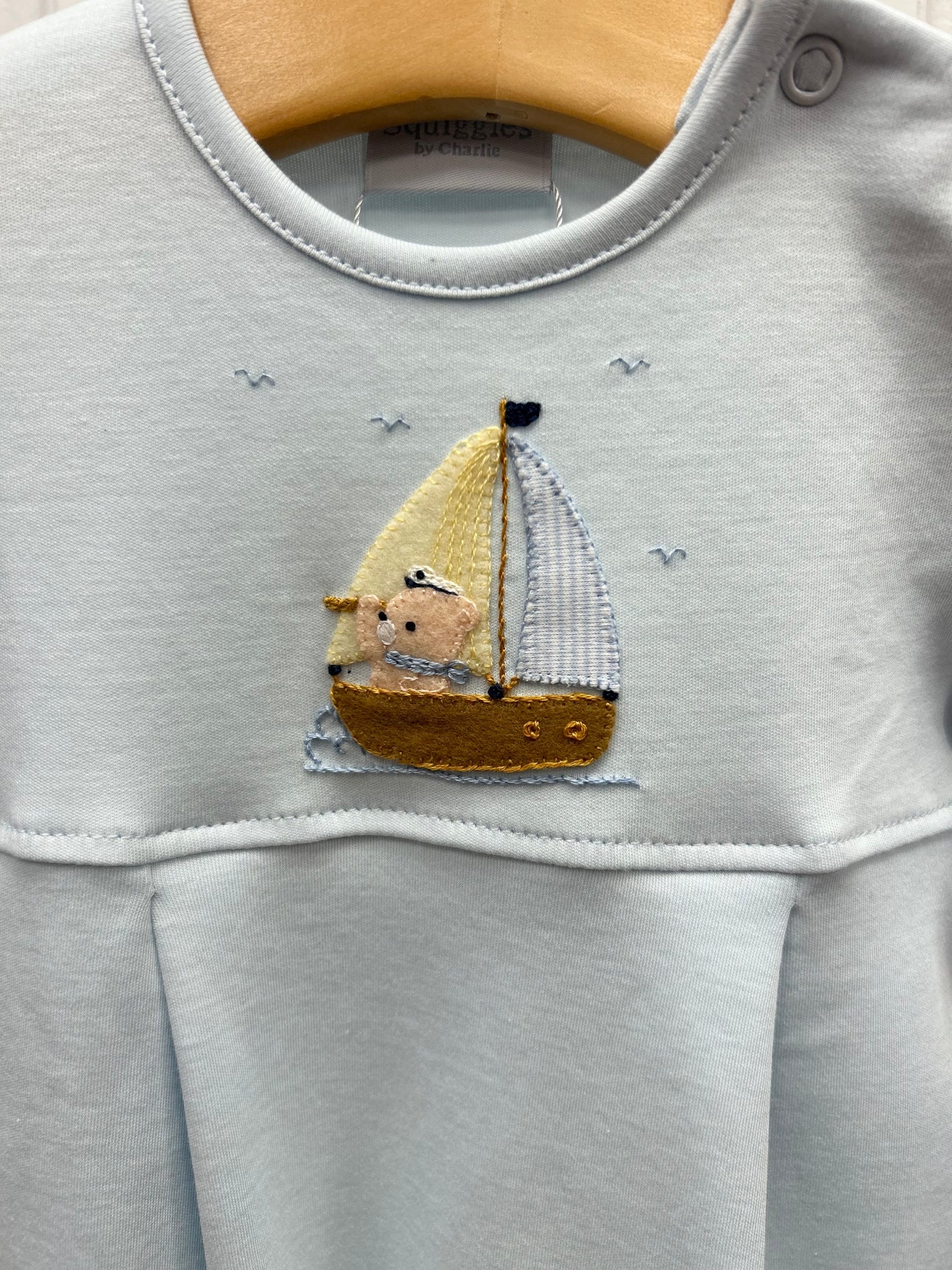 Let your little one set sail in style with this Infant Boy's Blue Bear Sailing Romper by Squiggles! Featuring an adorable bear sailing appliqué, this soft blue romper is perfect for any adventure. Made with comfort and cuteness in mind, it's a must-have for your little sailor!
