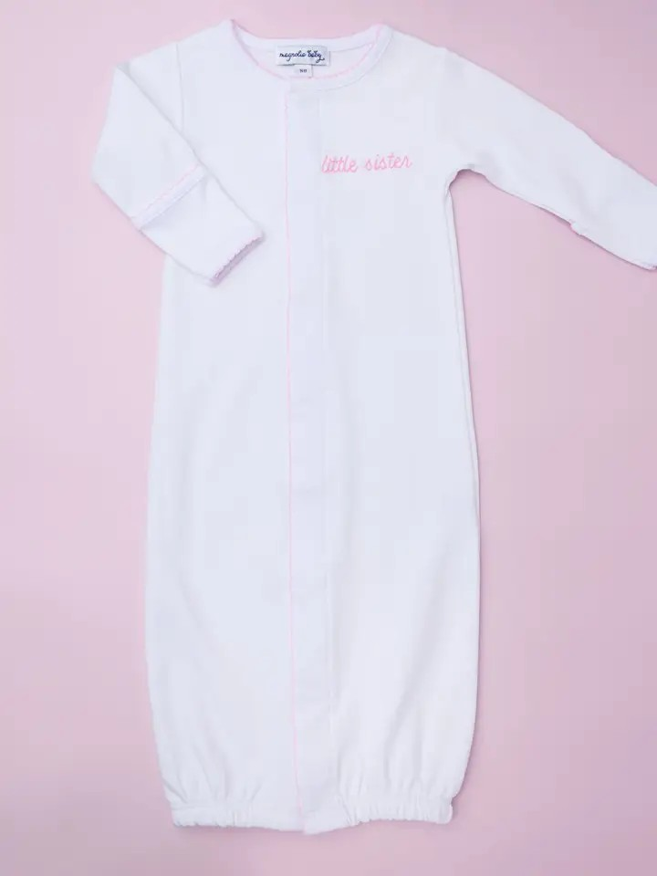 Introducing the Little Sister Converter, a must-have for any new baby sister! This white converter from Magnolia Baby features delicate pink embroidery, making it the perfect canvas for a personalized monogram.