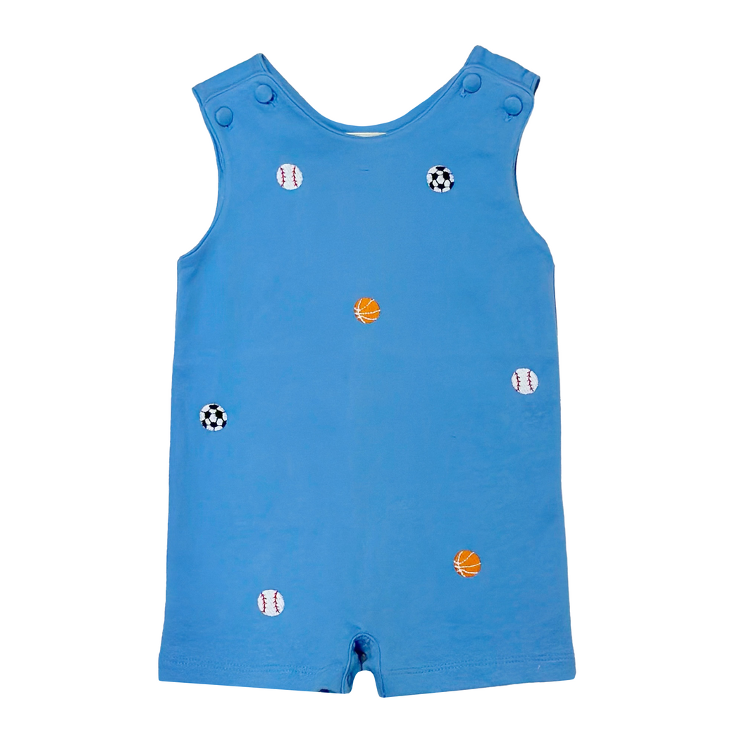 Introducing the Periwinkle Sports Knit Shortall from Zuccini Kids! Perfect for infant boys, this soft periwinkle shortall is adorned with embroidered classic sports balls for a touch of athletic charm. Comfortable and stylish, it's a must-have for your little one's wardrobe.