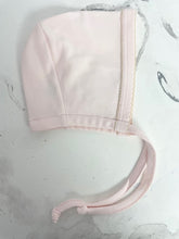 • Load image into Gallery viewer, Add a touch of sweetness to your newborn's wardrobe with our Pima Cotton Embroidered Bonnett from Squiggles. Made from high-quality Pima cotton, this bonnet is soft and delicate on baby's skin. The light pink and light blue embroidery add a charming touch, making it a perfect gift addition for any newborn. Complete the look with our matching Embroidered Converter from Squiggles.